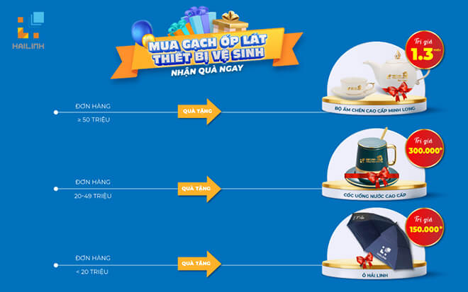 Bên cạnh đó, 100% khách hàng mua gạch ốp lát – thiết bị vệ sinh, phụ kiện, thiết bị nhà bếp,… nhận ngay quà tặng hấp dẫn theo giá trị đơn hàng:
