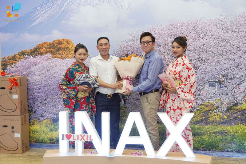 Ông Nguyễn Văn Điền – Giám đốc công ty TNHH Kinh doanh Thương mại Hải Linh tặng hoa ông Masahiko Hiramoto 平本 公彦 – Tổng giám đốc tập đoàn Lixil. Là cửa hàng phân phối chính hãng thiết bị vệ sinh INAX, Hải Linh cũng có riêng một gian hàng để đón tiếp khách trong chương trình FLASH SALE